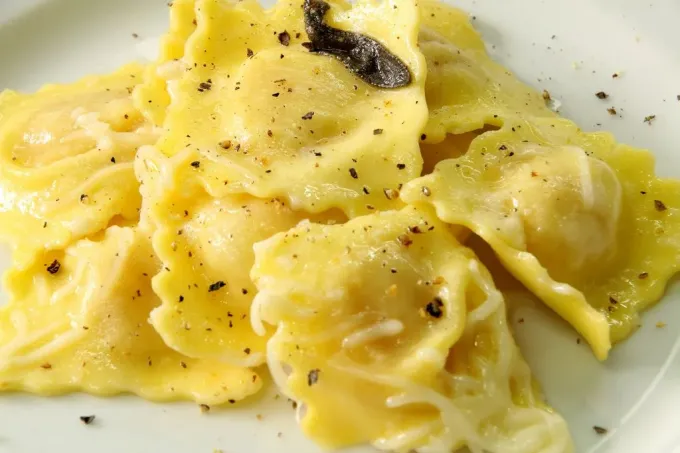 Ravioli jsou těstoviny plněné nejčastěji masovou směsí či sýrem. Ravioli burro e salvia se připravují na másle a šalvěji a jsou posypány parmazánem.