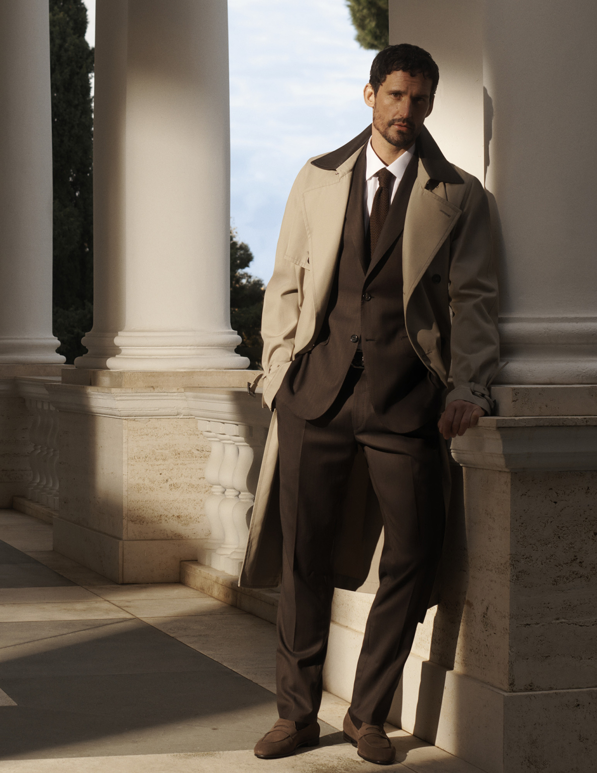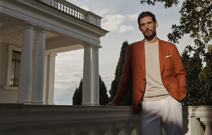 Nadčasové lehké tkaniny jako Solaro, dekonstruovaná saka, včetně ikonického stylu Soffio a krejčovské svrchní oděvy interagují se světlem, čímž zvýrazňují texturu a hloubku tónů.