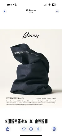 Pečlivě kurátorovaný výběr látek Utopia Super 220’s je k dispozici v některých butikách Brioni po celém světě. Je určen pro klientelu, která hledá nejen výjimečný oděv, ale i hlubší smysl — respekt k procesu, ruční práci a hodnotám, které obstojí v čase.