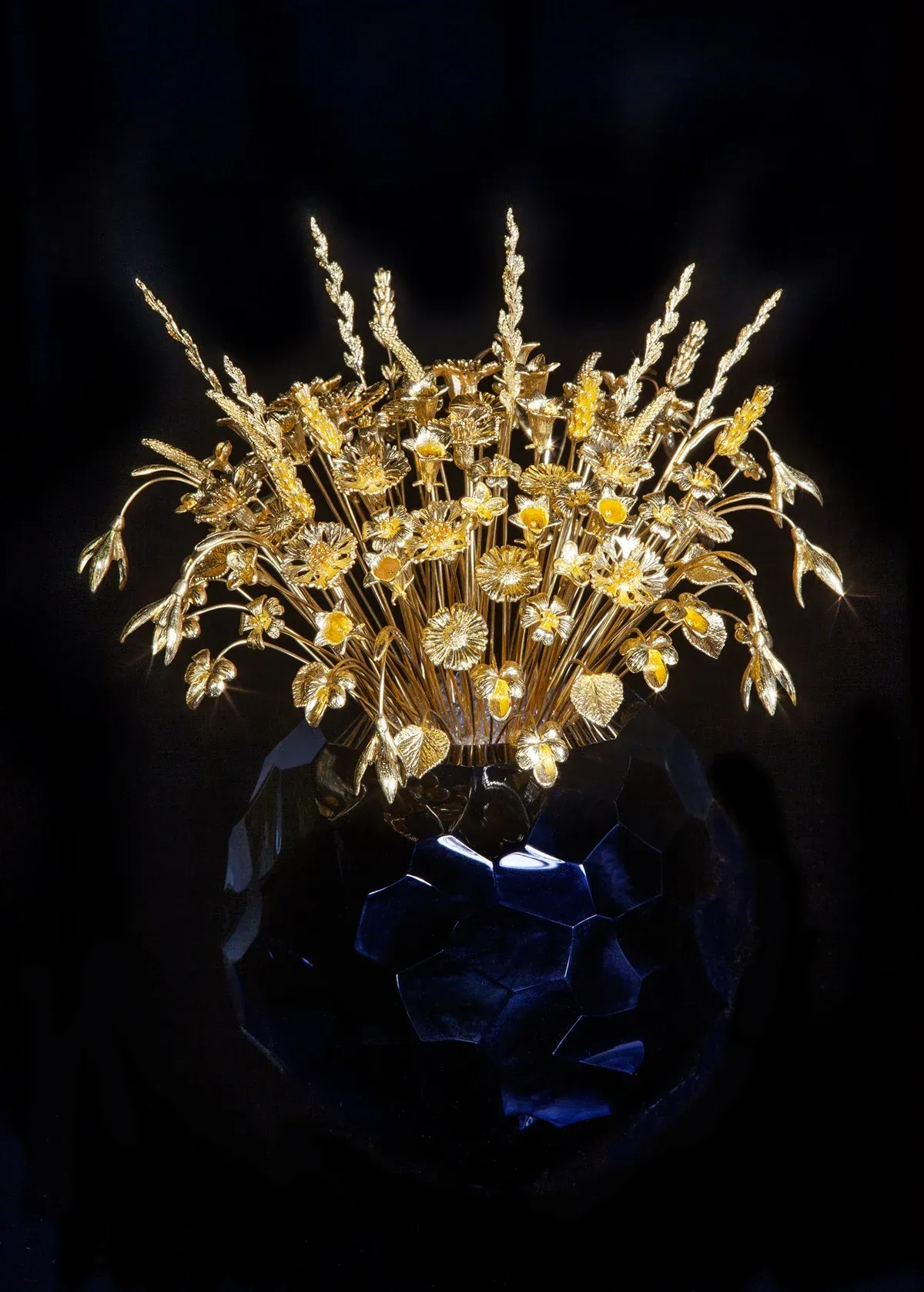 Kytice GIYOU s 118 květy z ryzího zlata ve váze Moser