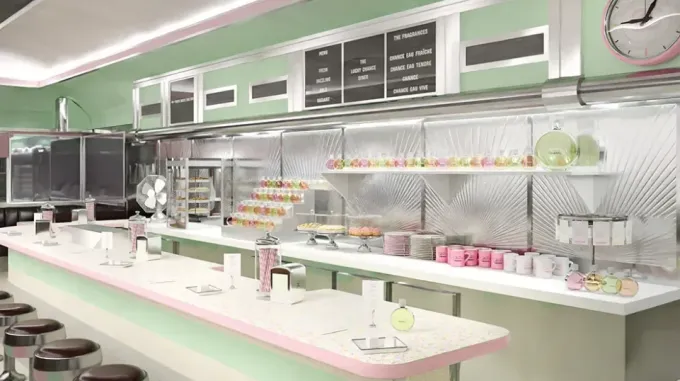 Lucky Chance Diner, zahalený do pastelově růžové a zelené, čerpá inspiraci z parfému Chance Eau Fraîche. Květinová vůně , kterou vytvořil domácí parfumér společnosti Chanel Olivier Polge, obsahuje tóny citronu, jasmínu a teakového dřeva. Je to jistě více osvěžující vůně než ta, která se obvykle vyskytuje ve vaší místní mastné lžičce.