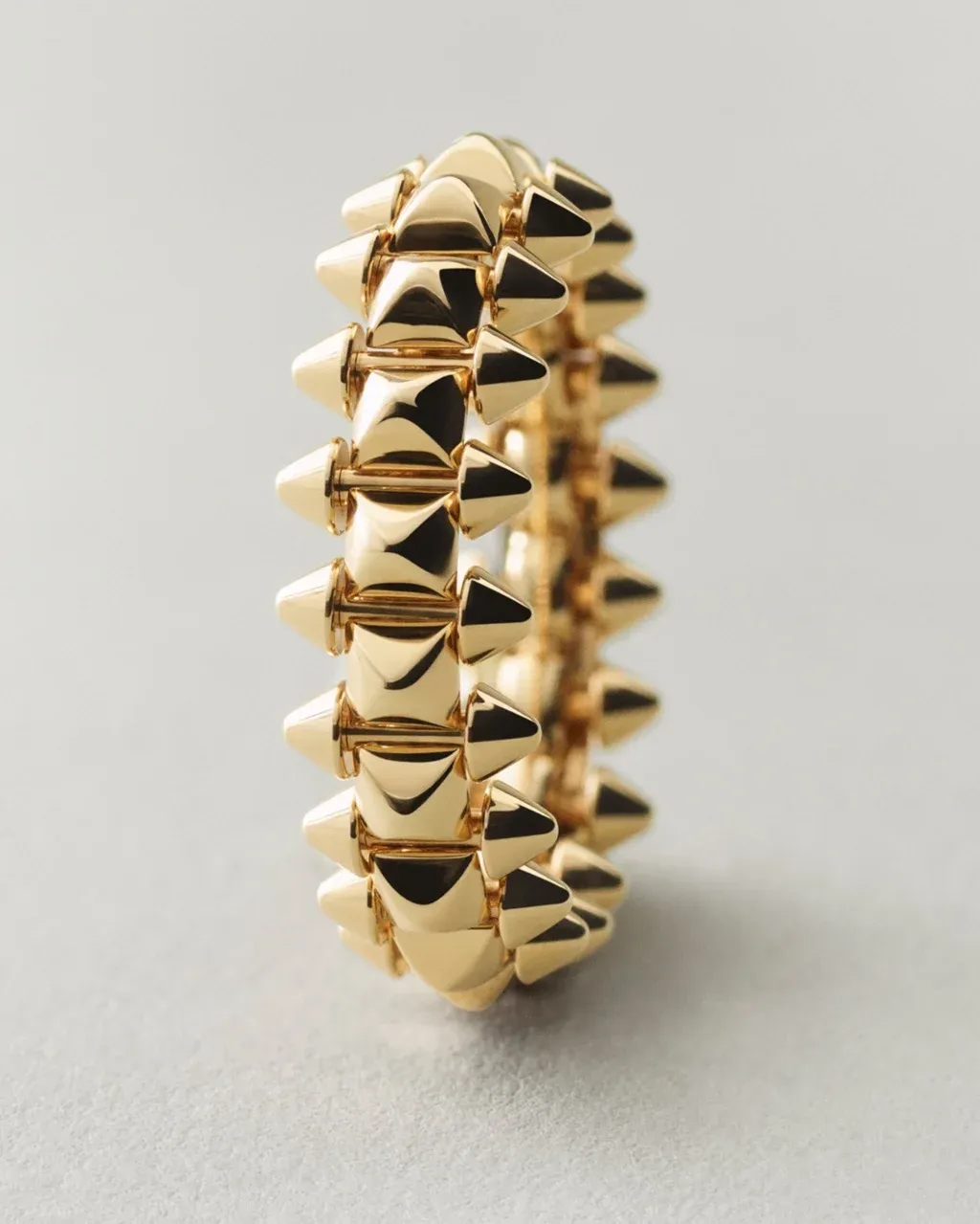 Clash de Cartier je postavená na napětí. Vizuálním, haptickém, konceptuálním. Vznikla z potřeby vyjádřit víc než jen krásu – říká něco o nositeli, o jeho postoji k životu. Spojuje strohost geometrie s měkkostí pohybu, kombinuje ostré pyramidové formy se smyslnou pružností. Když se na šperk podíváte, vidíte pravidla. Když ho vezmete do ruky, cítíte svobodu. A právě v tom je jeho kouzlo. Tento kontrast není náhodný. Cartier vědomě staví klasickou francouzskou eleganci proti prvkům punku a industriální estetiky. V kolekci se opakují motivy clous carrés – drobných hranatých „cvoků“, které se díky precizní konstrukci pohybují s tělem, aniž by ztrácely formu. Vizuální síla je tak vyvážena ergonomií, šperk není statický, ale žije s nositelem.