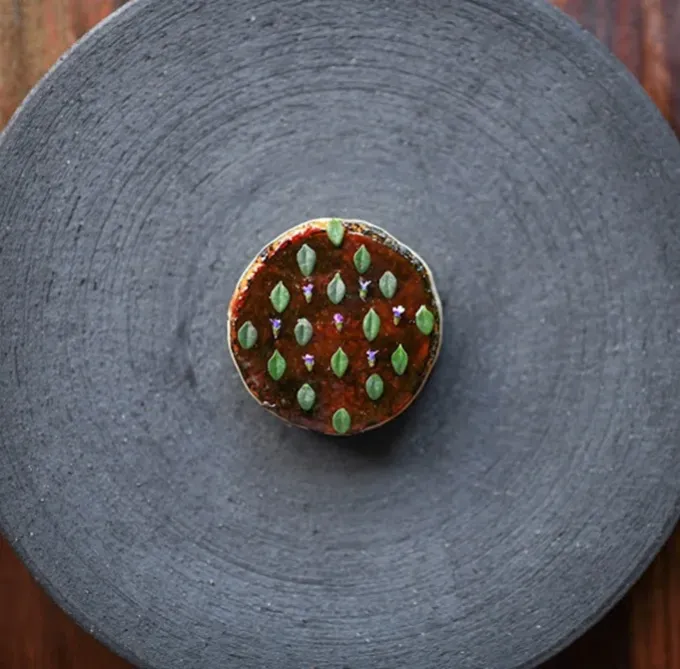 Jedním z vrcholů menu je „Chilled Carrot Soup with Yuba, Mustard Seeds, and Ash“, kde je chladivá mrkvová polévka servírována s jemnými plátky yuby (sojové kůžičky) a křupavými hořčičnými semínky, což vytváří harmonii mezi sladkostí mrkve a pikantností hořčice. Tento pokrm je skvělou ukázkou minimalistického přístupu, který se v Coi uplatňuje – důraz je kladen na čistotu chutí a precizní prezentaci.