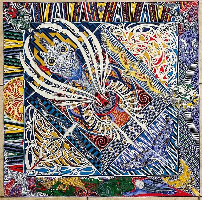 Hlavním motivem šátku je sova, tedy posel putující mezi hmotným a duchovním světem, která se vznáší nad čtyřmi stěnami, jež vytyčují dům, místo setkávání celého kmene. V severním cípu se nacházejí symboly vědění a spojnice s oblohou, v jižním stvoření a vody, ve východním světla a obřího orla, na kterém Maorové cestovali. V západním jsou albatrosí slzy vyjadřující utrpení tohoto národa. Středový kruh, který je živoucí směsí kultur, zastupuje obří chobotnici, symbol mořeplavby, a její chapadla osm směrů maorského kompasu.