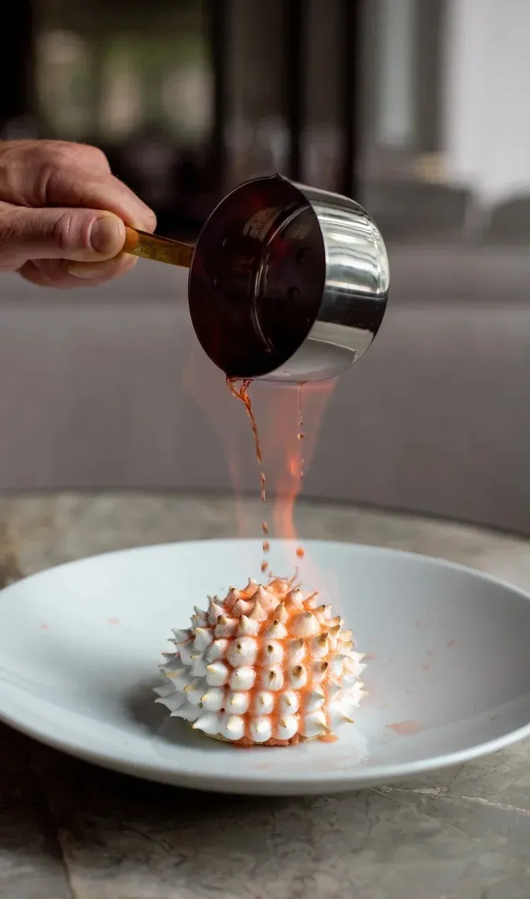 Závěr večera přináší na stůl skutečný zážitek. Pečená Aljaška se stává hvězdou okamžiku, která se dokončuje přímo před vámi flambováním likérem Grand Marnier. Modré plameny vytváří na italském meringue tenkou, hřejivou karamelovou vrstvu, která stojí v dokonalém kontrastu s mrazivým obsahem. Dezert v sobě skrývá vrstvy piškotu s lískovými ořechy a čokoládového krému, které kontrastují s chladem vanilkové zmrzliny a kyselostí malinového sorbetu.