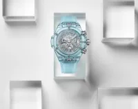 Hublot opět posouvá hranice možností vývoje barevných safíru a představuje limitovanou edici Big Bang Unico Water Blue Sapphire – pouhých 50 kusů hodinek v jemném, ale výrazném odstínu modré barvy inspirované tropickými lagunami. Nejde jen o pouhou změnu pigmentů. Docílit tak specifické barvy vyžaduje přesnost složení, technické know-how a precizní zvládnutí výroby. V tomto případě navíc Hublot pracuje s typickou vrstvenou konstrukcí modelu Big Bang, která už tak vysoké nároky ještě zvyšuje. Průhledné pouzdro o průměru 44 mm a lunetu ze světle modrého safíru doplňuje ladící kaučukový řemínek a modré detaily na číselníku. Uvnitř pouzdra se ukrývá ikonický kalibr Unico – automatický chronograf s rezervou chodu 72 hodin, složený z 354 komponentů, navržený pro maximální výkon a spolehlivost. Pro tento model byl strojek vyveden v elegantním šedém tónu, který podtrhuje jeho vizuální čistotu.