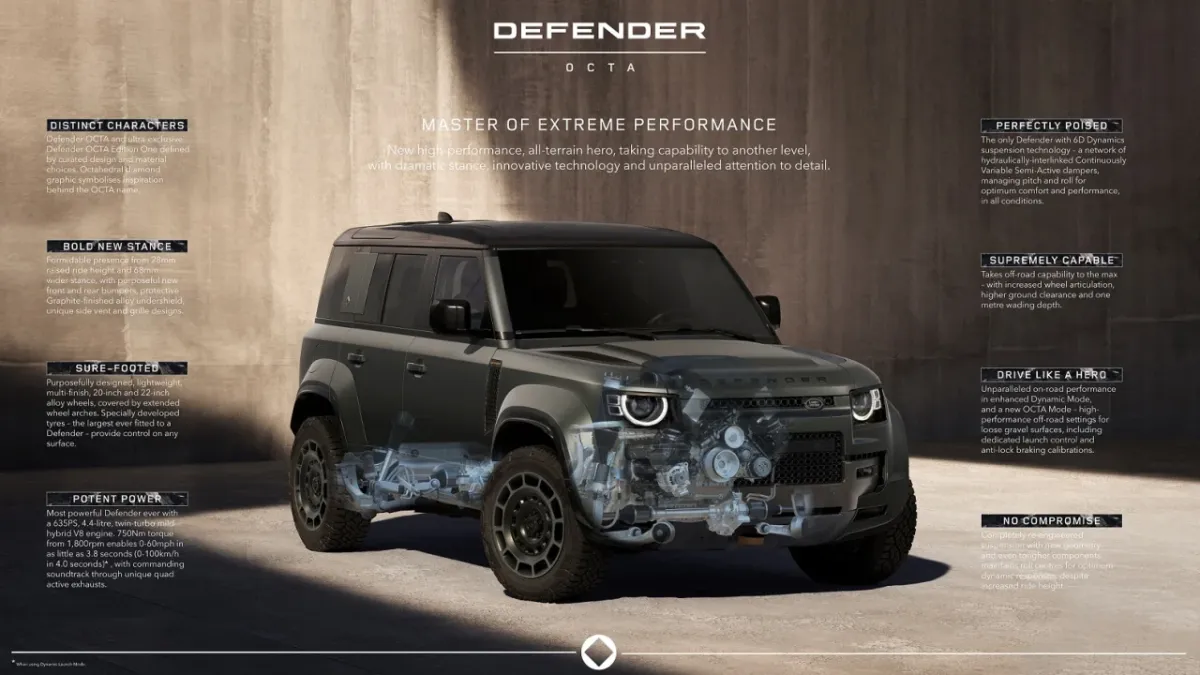 Verze OCTA, poháněná mild-hybridním V8 Twin Turbo o objemu 4,4 litru, je nejextrémnější a nejvýkonnější Defender všech dob. Jeho výkon 635 koní a točivý moment 750 Nm dovolují TISKOVÁ ZPRÁVA zrychlení 0–100 km/h za 4,0 sekundy, přičemž maximální točivý moment je k dispozici od pouhých 1800 min -1 do téměř 6000 min -1 , což zajišťuje výjimečnou využitelnost parametrů motoru. Výrazně přepracované komponenty podvozku s inovativními technologiemi, včetně systému 6D Dynamics, zajišťují, že dynamické schopnosti vozu jsou posunuty na zcela novou úroveň. Nový Defender OCTA vybavený 22“ koly z lehké slitiny a celoročními pneumatikami dosahuje maximální rychlosti 250 km/h.