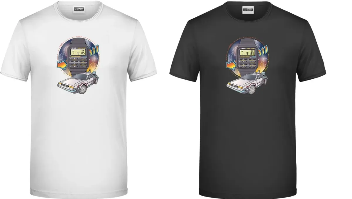 Na tričku, které prodejem podpoří Fond ohrožených dětí a jejich Klokánky, tedy zařízení pro děti vyžadující okamžitou pomoc, se po boku digitálních Casio CA-50 prezentuje také supersport DMC DeLorean, který ve filmu posloužil jako stroj času. Ten ve filmu zhotovil šílený Doktor Brown, zatímco v reálném světě stál za jeho nekompromisním designem s výklopnými gull-wing dveřmi italský návrhář Giorgetto Giugiaro.