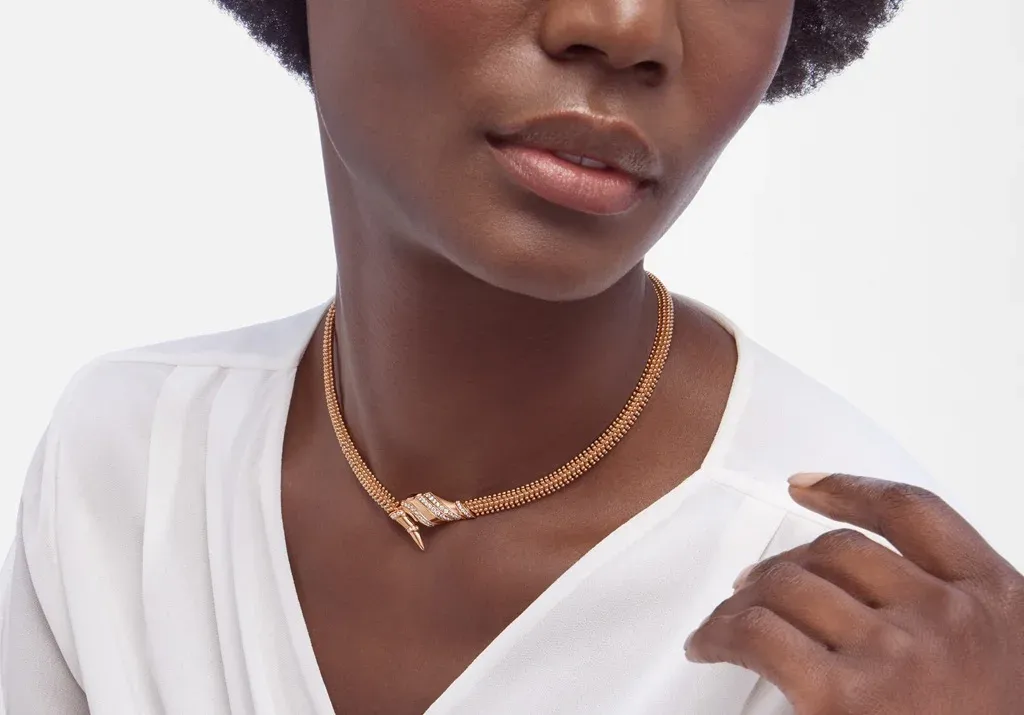 Nová kolekce z růžového zlata staví do popředí typické flexibilní korálky, které podtrhují plynulost linií i smyslnou přitažlivost každého jednoho designu. Náhrdelník se ladně obtáčí kolem krku. Hlava a ocas hada se s působivou elegancí setkávají v přední části, zatímco jednoduchý náramek smyslně lemuje zápěstí.