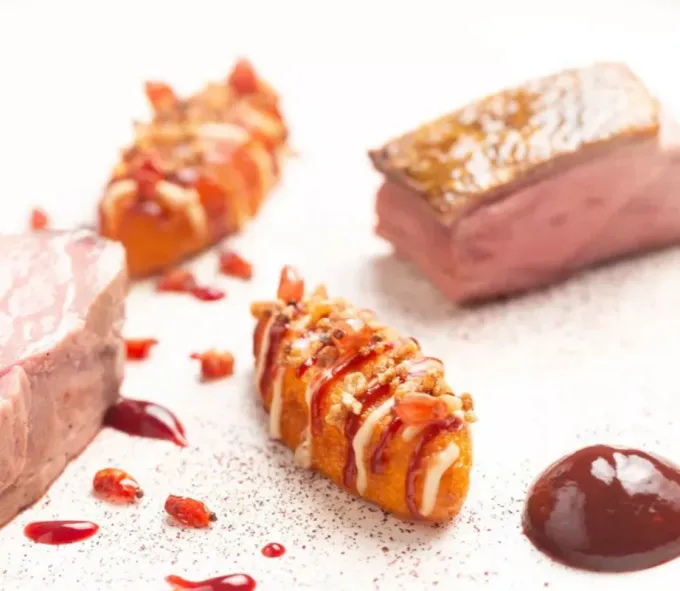 Dalším nezapomenutelným chodem je Skotský losos, který je marinovaný v sake a yuzu, což mu dodává jemnou citrusovou příchuť, která dokonale ladí s texturou ryby. Tento pokrm je servírován s krémem z wasabi, který přidává mírnou pikantnost, aniž by přehlušil přirozenou chuť lososa.