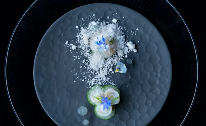 Degustační zážitek začíná jemnými předkrmy, jako je sakizuke – malý chod, který otevírá paletu chutí s lehkostí a elegancí. Nedávno se v menu objevil sakizuke s hokkaidským hřebenatkem a želé z chřestu, který je doplněn jedlými slunečnicemi. Tento pokrm je nejen vizuálně nádherný, ale také dokonale sladěný, kdy se svěžest mořských plodů mísí s jarními tóny chřestu.