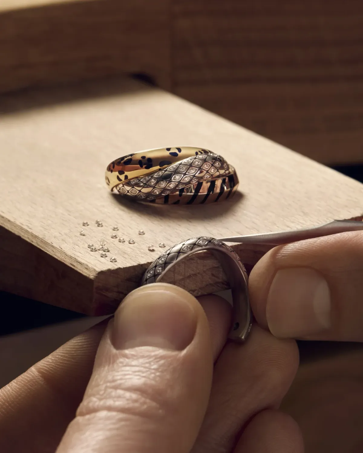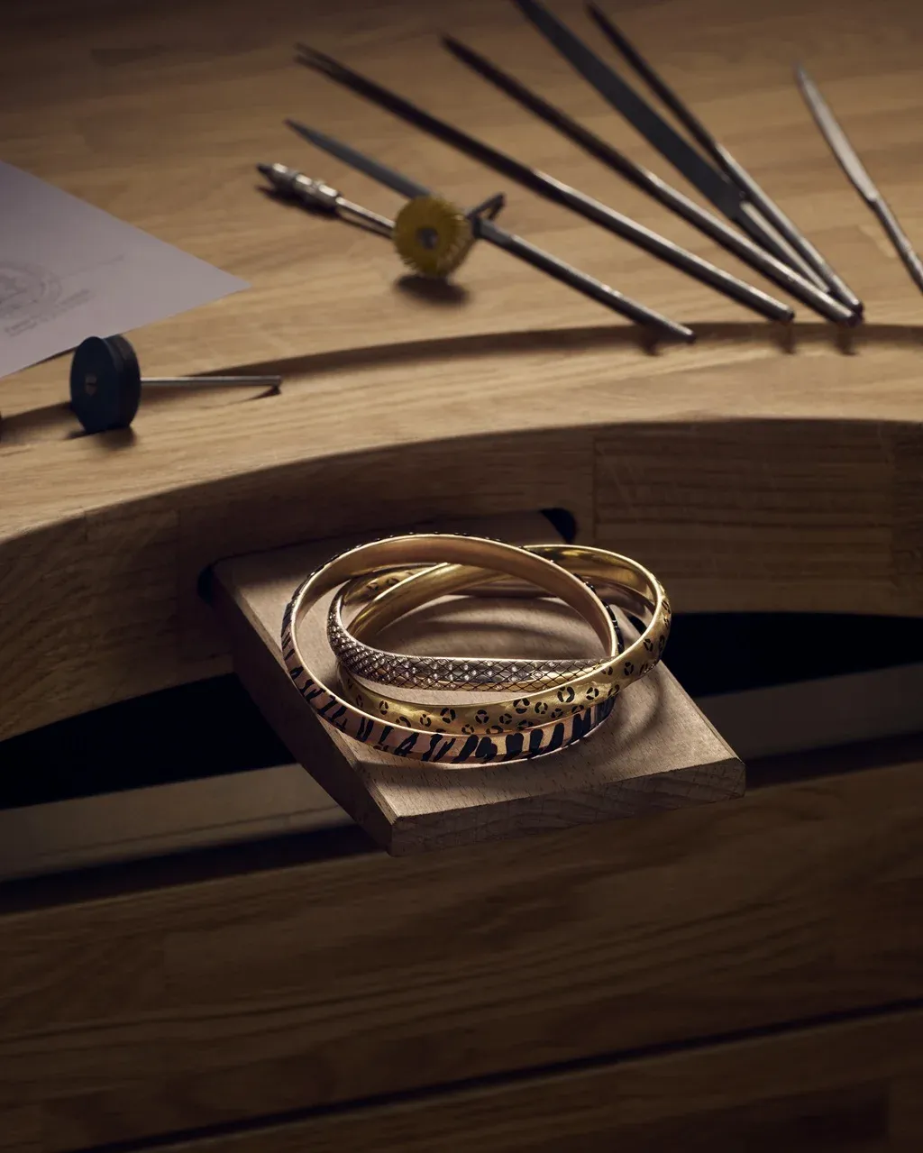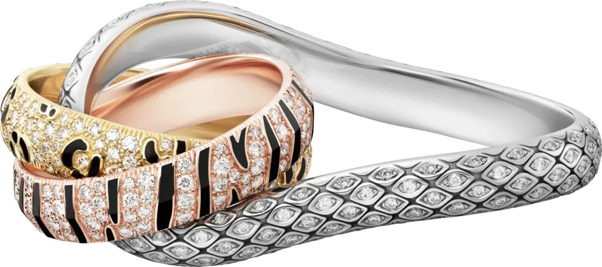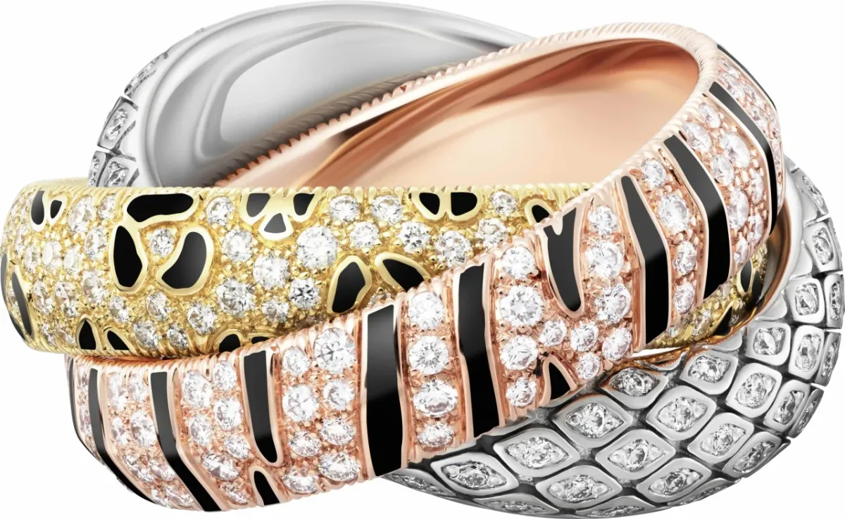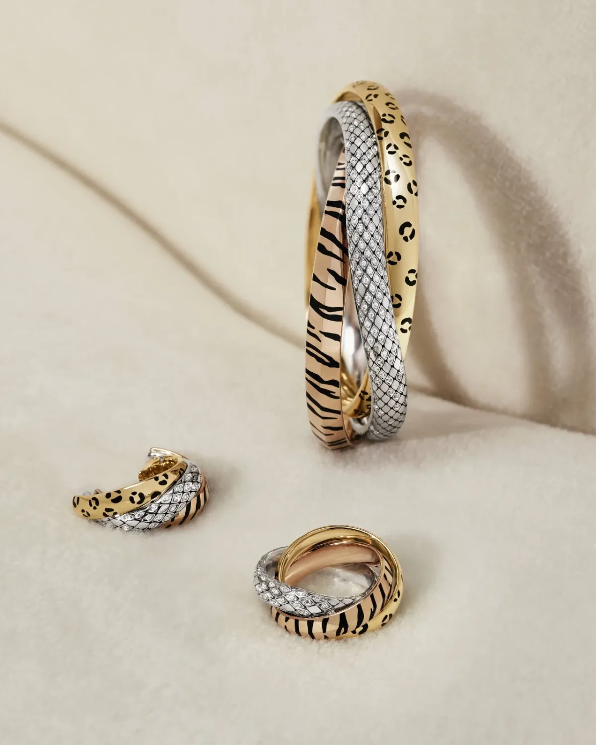 Do designu Trinity vstupují tři symbolická zvířata fauny Cartier – panter, tygr a had. Každý šperk kombinuje tři druhy zlata s ručně aplikovanými detaily: hadí šupiny na bílém zlatě, tygří pruhy na růžovém zlatě a panteří skvrny na zlatě žlutém. Promyšlená hra s designem se promítá i do tvarů jednotlivých kroužků, z nichž každý je jiný: zvlněný pro hada, zkosený pro tygra a zaoblený pro pantera. Odvážné a mnohovrstevné interpretace šperků Trinity přinášejí nové hravé způsoby nošení, jako jsou prsteny přes dva prsty nebo single náušnice. Veškeré motivy z černého laku jsou nanášeny ručně a u celodiamantových verzí je využívána speciální technika spočívající v ohraničení kroužků z růžového a žlutého zlata sérií drobných ručně rytých zářezů.