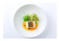 Pečená polární treska s pórkovými raviolami, kapustou, fava fazolkami a omáčkou XO beurre blanc.