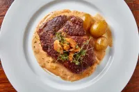 Jako hlavním chod na mě čekal lahodný Rib eye steak s grilovanou zeleninou, hranolkami a krémovou omáčkou. Steak byl perfektně upečený podle mého přání, maso bylo měkké a šťavnaté, plné chutí. Grilovaná zelenina byla krásně barevná a chuťově velmi lahodná, hranolky byly krásně křupavé a společně s krémovou omáčkou byl tento chod velmi bohatý a plný chutí. Byl to velmi vydařený pokrm.