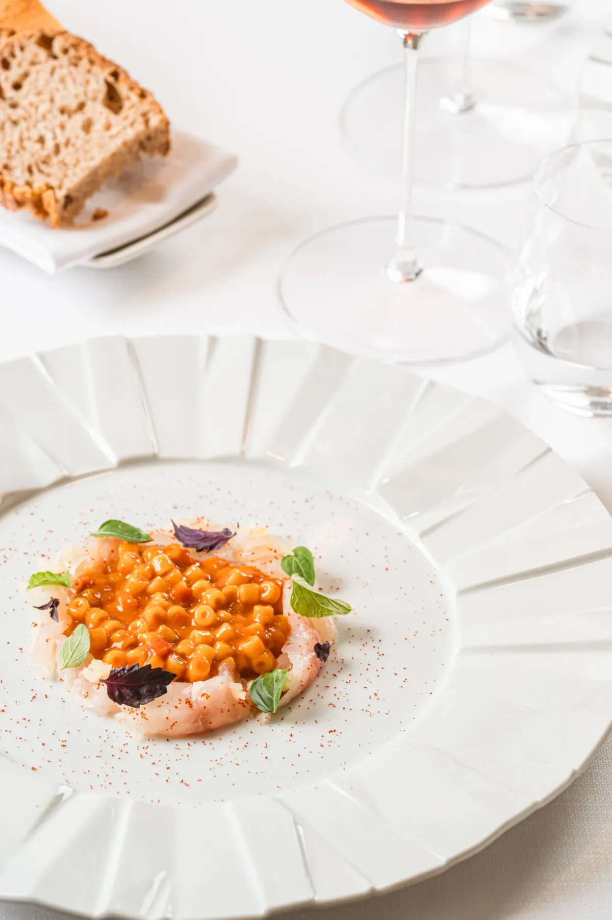 Následovaly ústřice s kompotem z šalotky a šampaňskou omáčkou, známé jako Ostriche, composta di scalogno e salsa allo Champagne. Kombinace svěžesti ústřic s jemnou sladkostí šalotky a bohatostí šampaňské omáčky byla naprosto dokonalá, představovala skvělý úvod do naší degustační cesty. Každé sousto přineslo závan mořské svěžesti, který se harmonicky snoubil s jemným, sladkým tónem šalotky a bohatou, krémovou omáčkou. Tento pokrm se stal oslavou rafinovaných chutí a textur, což dokládalo nejen kulinářskou zručnost kuchařů, ale také pečlivě vybrané ingredience, které dokázaly povznést jednoduché ústřice na skutečný gastronomický zážitek.