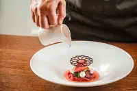 Další chod, Tagliatelle di seppia alla puttanesca, přinesl na stůl inovativní přístup k tradičnímu italskému receptu. Těstoviny vyrobené ze sépie, precizně nakrájené do tenkých, ale pevných proužků, se dokonale snoubily s pikantní puttanesca omáčkou. Omáčka, připravená z kvalitních surovin jako jsou rajčata, kapary, olivy a ančovičky, byla jemně pálivá a bohatá na chutě, což přidalo celému chodu nečekanou, ale velmi příjemnou hloubku a komplexnost. Tento pokrm, pečlivě vytvořený šéfkuchařem, nejen že zachoval tradiční italské prvky, ale zároveň předvedl moderní gastronomické techniky a kreativitu, které společně vytvořily harmonickou a fascinující kulinářskou zkušenost.