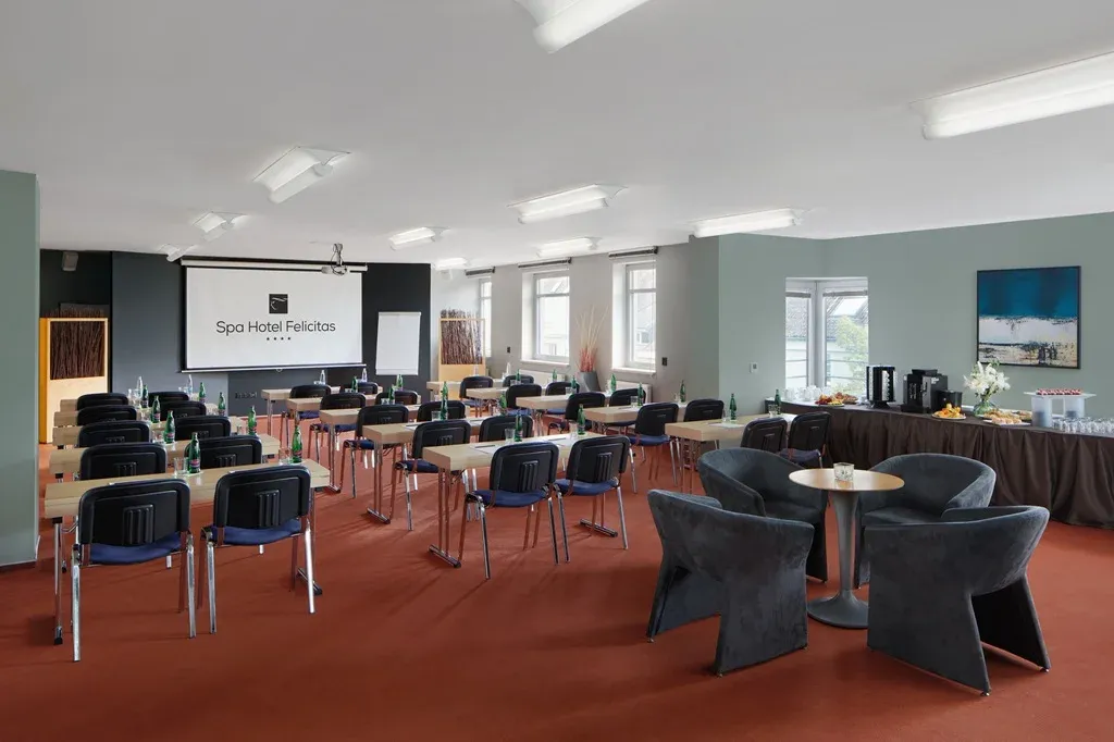 Spa Hotel Felicitas však není pouze destinací pro wellness a léčbu. Svou infrastrukturu přizpůsobil také nárokům obchodních klientů, kteří hledají profesionální prostředí pro konference, školení nebo teambuildingy. Moderně vybavená konferenční místnost se nachází přímo v hotelovém komplexu a umožňuje pohodlné propojení pracovních povinností s relaxací, čímž vzniká přirozený rytmus dne, kde je produktivita vyvážena regenerací.