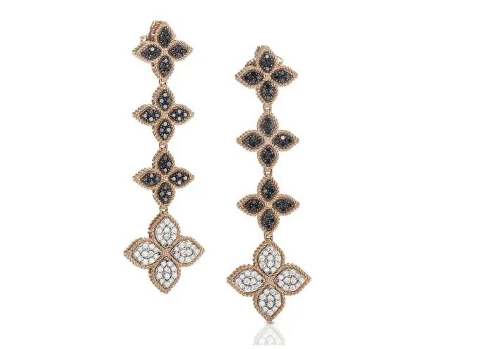Náušnice z růžového zlata s černými a čirými diamanty.