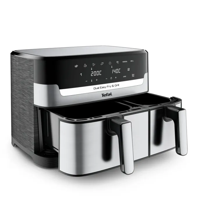 Tefal Dual Easy Fry & Grill, novinka značky Tefal, přináší revoluci do přípravy jídel. Je vysoce multifunkční a výkonná. Díky zbrusu nové horkovzdušné fritéze můžete nyní připravovat oblíbené recepty mnohem zdravěji, rychleji a efektivněji. Velká kapacita vám umožní nachystat pokrmy bez problémů pro celou rodinu nebo milou nečekanou návštěvu, a to hned dvojím způsobem: S inovativní horkovzdušnou technologií připravíte zdravější jídlo a s integrovanou grilovací funkcí ugrilujete pokrm přesně na míru. A k tomu vše najednou – ve dvou separátních nádobách přímo ve fritéze.