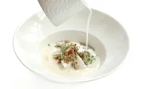 Studená polévka z bílého chřestu, hroznové víno, vlašské oříšky.