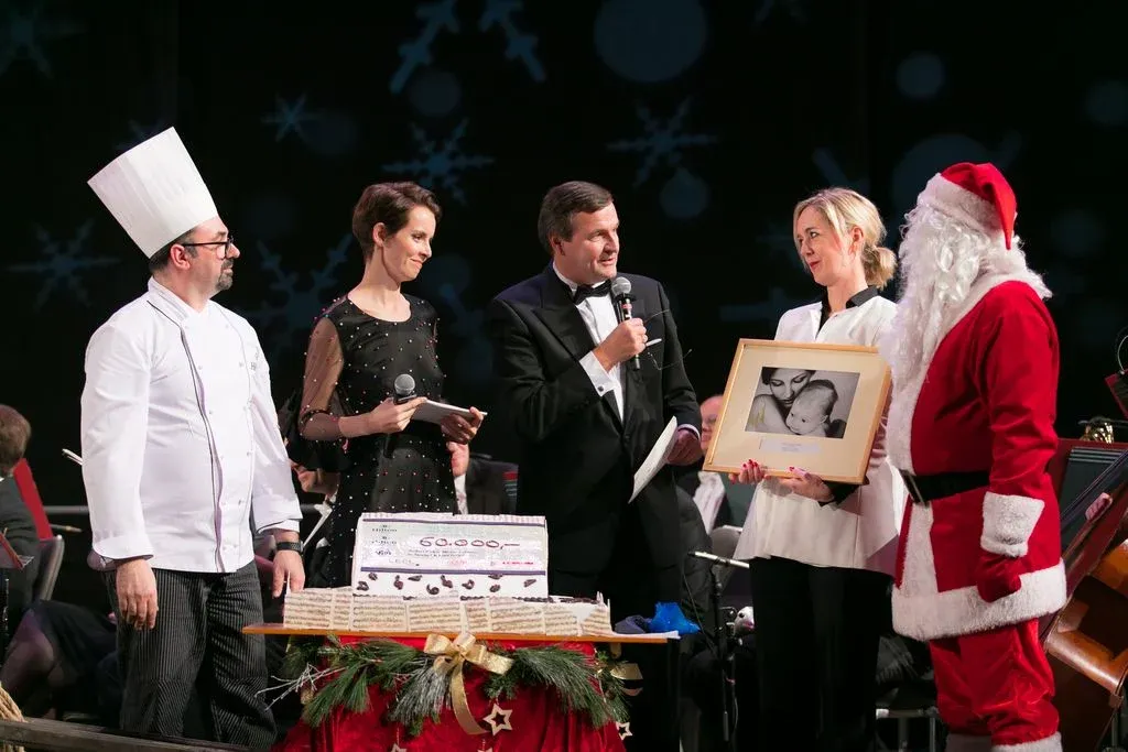 Šéfkuchař hotelu Hilton Prague Franco Luise překvapil hosty nejen výtečnou večeří po koncertě, ale i speciálním šekem na částku 60 000 Kč ve formě dortu, který generální ředitel hotelu Hilton Prague Michael Specking slavnostně předal Terezii Sverdlinové z Nadace Terezy Maxové Dětem.