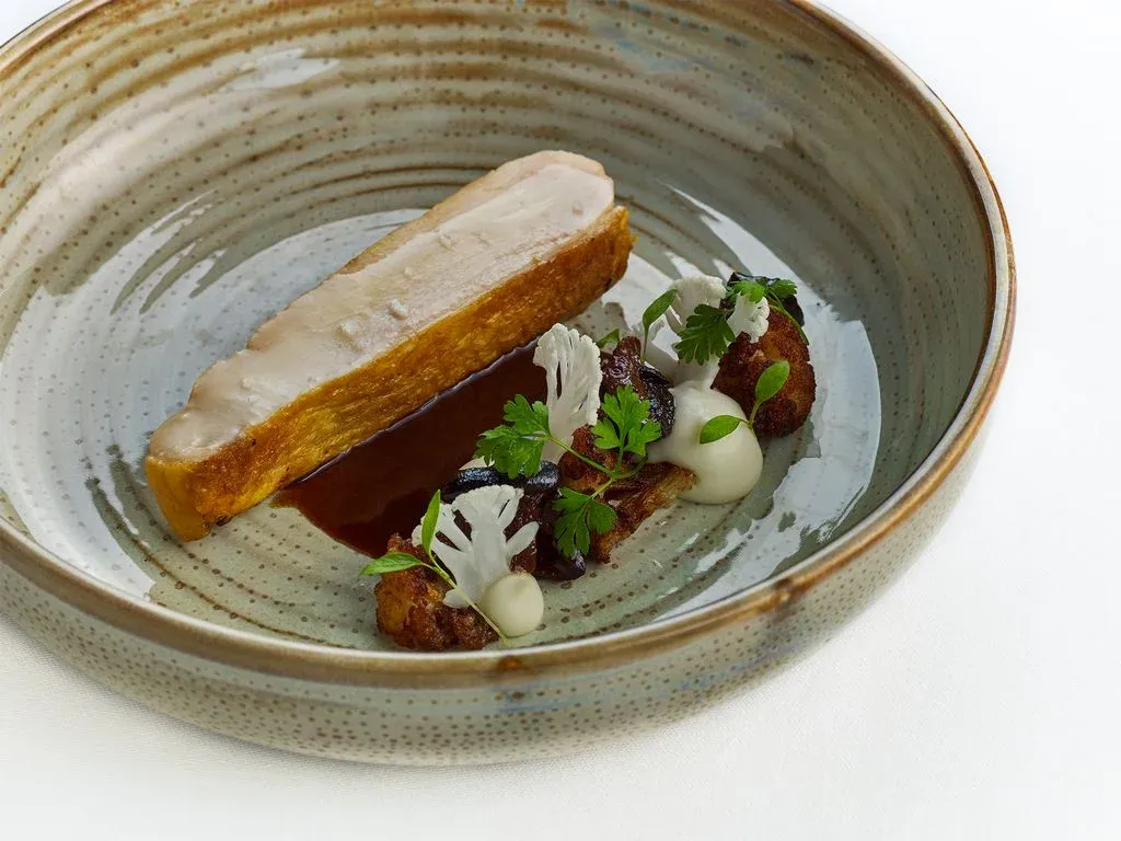 Dalším chodem je mořský vlk, ryba dovážená přímo z Francie. Jan Knedla jej doplňuje svojí specialitou, šampaňskou emulzí, která je mimořádně náročná na přípravu, ale o to komplexnější chutí vyniká a zauzeným pórkem s takzvaným oříškovým máslem – beurre noisette. Kompozici doplňuje domácí petrželový olej. Poté je na řadě francouzské kukuřičné kuřátko, doplněné speciálně připraveným květákem a houbovým ragú.