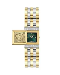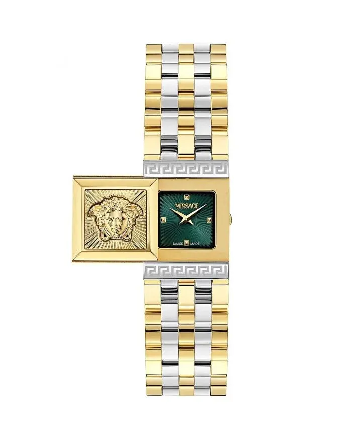 Pouzdro modelu má rozměry 25 x 18 mm a je zhotoveno v IP žlutém zlacení. Dominantním prvkem je plastická hlava Medusy umístěná na posuvníku, jež připomíná symbolické kořeny značky. Náramek v ladícím zlatém provedení s motýlkovou sponou obepíná zápěstí s lehkostí a přitom působí jako výrazný šperk. Tato kombinace spojuje eleganci šperkařského řemesla s přesností hodinářské techniky.