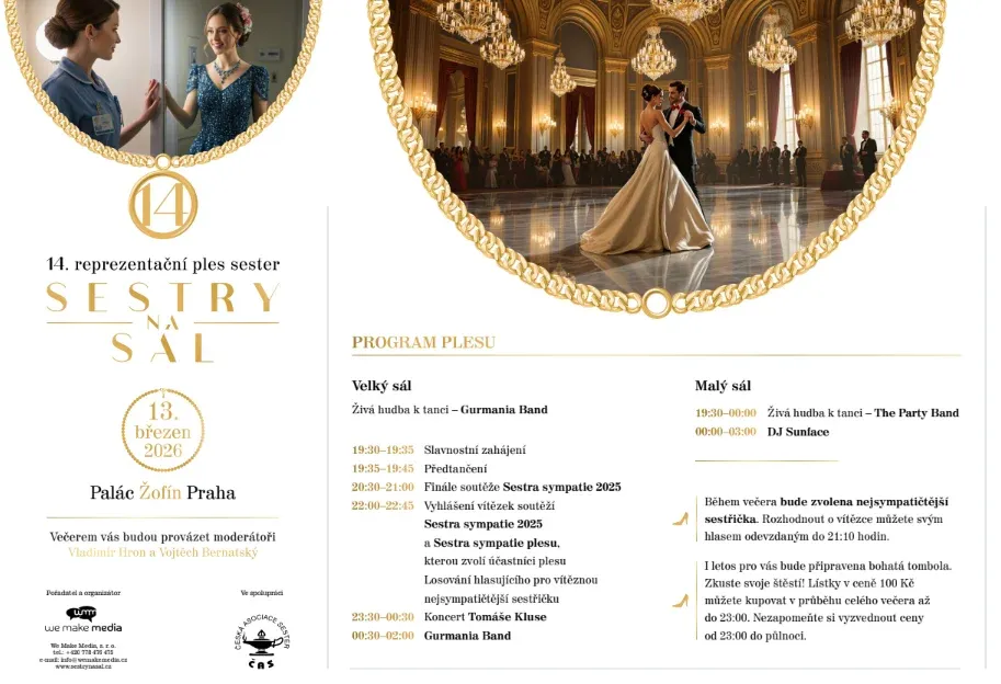 Blíží se oblíbený reprezentační ples sester s příznačným názvem Sestry na sál!, který se pořádá jako poděkování sestrám za jejich náročnou práci. Letošní, již 14. ročník, se bude konat 13. 3. 2026 v paláci Žofín. Vyvrcholením plesu bude finálové kolo soutěže Sestra sympatie 2026 a slavnostní vyhlášení vítězky. Program zpestří bohatá tombola. Přijďte s námi vzdát hold sestrám a ocenit jejich nenahraditelnou práci! Vstupenky na ples si můžete koupit už nyní na portálu GoOut.