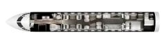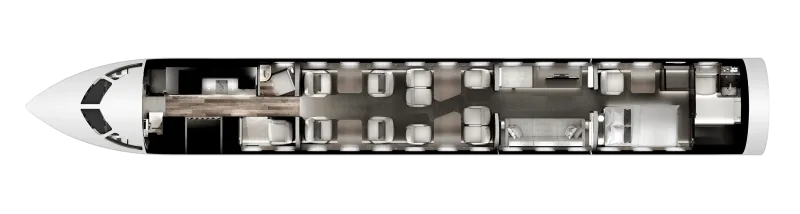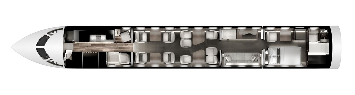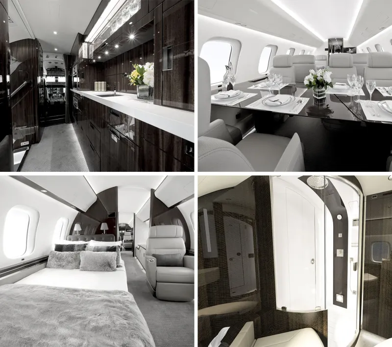 Interiér je rozdělen do čtyř plnohodnotných obytných zón, které lze plně přizpůsobit potřebám majitele. Kabina nabízí nejnižší tlakovou výšku v odvětví, což dramaticky snižuje negativní projevy jet lagu a únavu po dlouhém letu. Cestující mají k dispozici prostornou kuchyni, konferenční a jídelní zónu, zábavní centrum a soukromou ložnici s manželskou postelí a vlastní koupelnou se sprchovým koutem. Každý detail je vyveden z těch nejluxusnějších materiálů, od ručně šité kůže až po exotické dřeviny a drahé kovy.