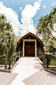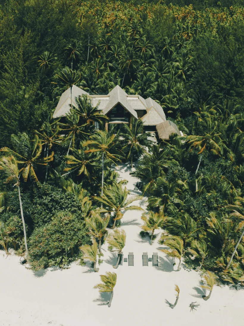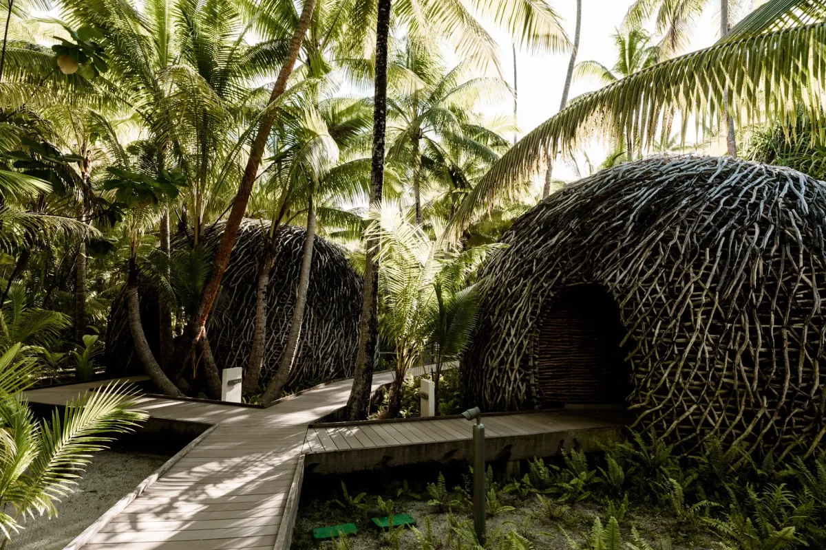 Architektura celého komplexu byla navržena tak, aby byla prakticky neviditelná z oceánu a co nejméně narušovala přirozený ekosystém ostrova. Každá z pětatřiceti luxusních vil je ukryta v husté tropické vegetaci přímo u bílých písečných pláží, což hostům zaručuje naprostou intimitu. Interiéry využívají výhradně přírodní materiály, jako je dřevo a kámen, a jsou doplněny soukromými bazény, které plynule přecházejí v nekonečnou modř laguny obklopující celý atol.