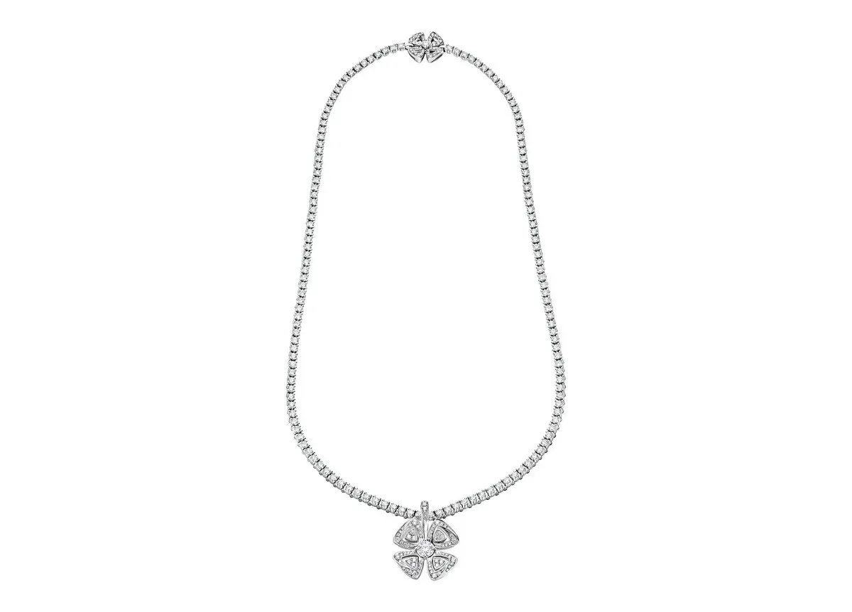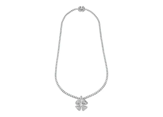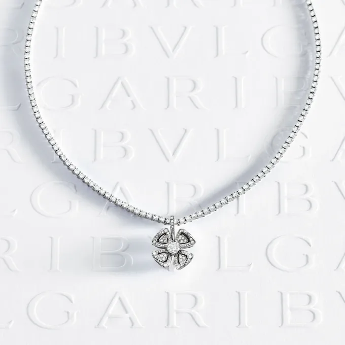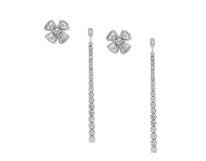 Značka Bvlgari pozvedá svůj kreativní a pokrokový přístup na novou úroveň a představuje exkluzivní sadu z bílého zlata a diamantů, složenou ze dvou víceúčelových šperků. Elegantní náhrdelník s diamanty v pavé osazení a hodnotě přesahující 6 karátů je zakončený uzávěrem ve formě drobné květinky. Je na něm zavěšený ikonický přívěsek s briliantem v centrální části, který se může jednoduše proměnit v třpytivou brož. Velmi ženské náušnice z bílého zlata zdobí kaskáda diamantů vycházející z typického motivu květiny. Pouhým odepnutím závěsného prvku se z nich v mžiku stanou univerzální šroubovací náušnice se 4 okvětními lístky. Výroba všestranných šperků je neoddělitelnou součástí DNA značky Bvlgari. Nyní se představuje v novém pojetí v podobě nositelných a zároveň i exkluzivních kreací, které kombinují neodolatelný třpyt se svěží a veselou podstatou kolekce Fiorever.