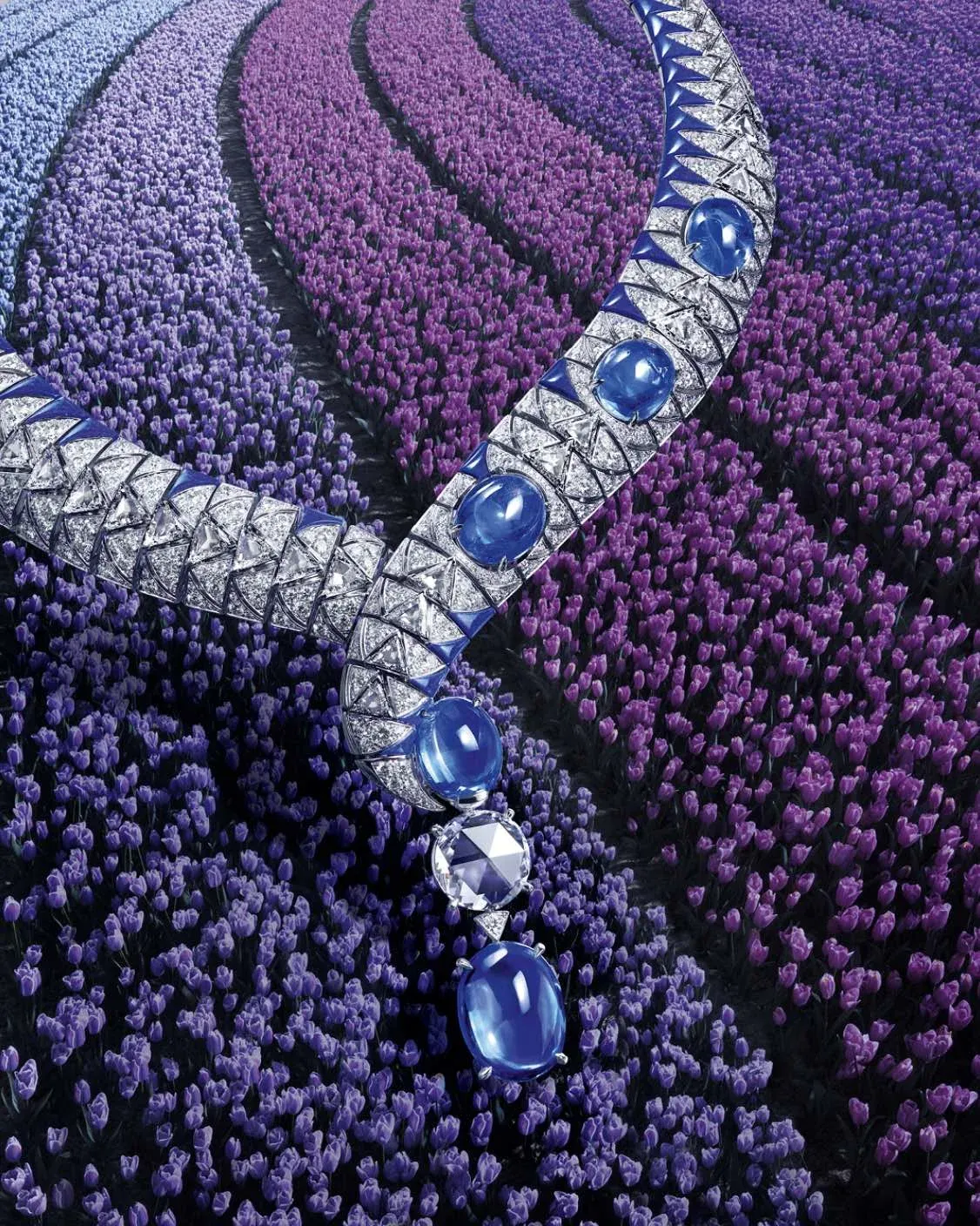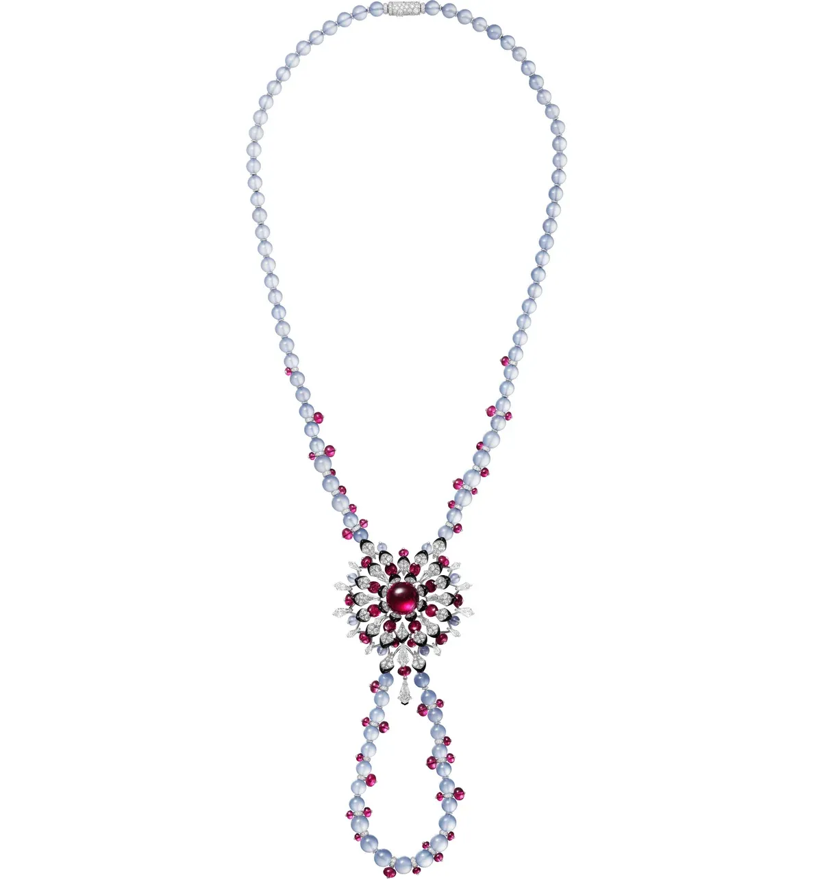 Ostrou přísnost tvarů zjemňuje velkolepá sada kabošonového chalcedonu. Dalším typickým rysem pro Maison jsou stylisticky odvážné a silné kontrasty. Zřetelné u volby jemných barev růžové a modré, avšak obklopených intenzivním černým onyxem.