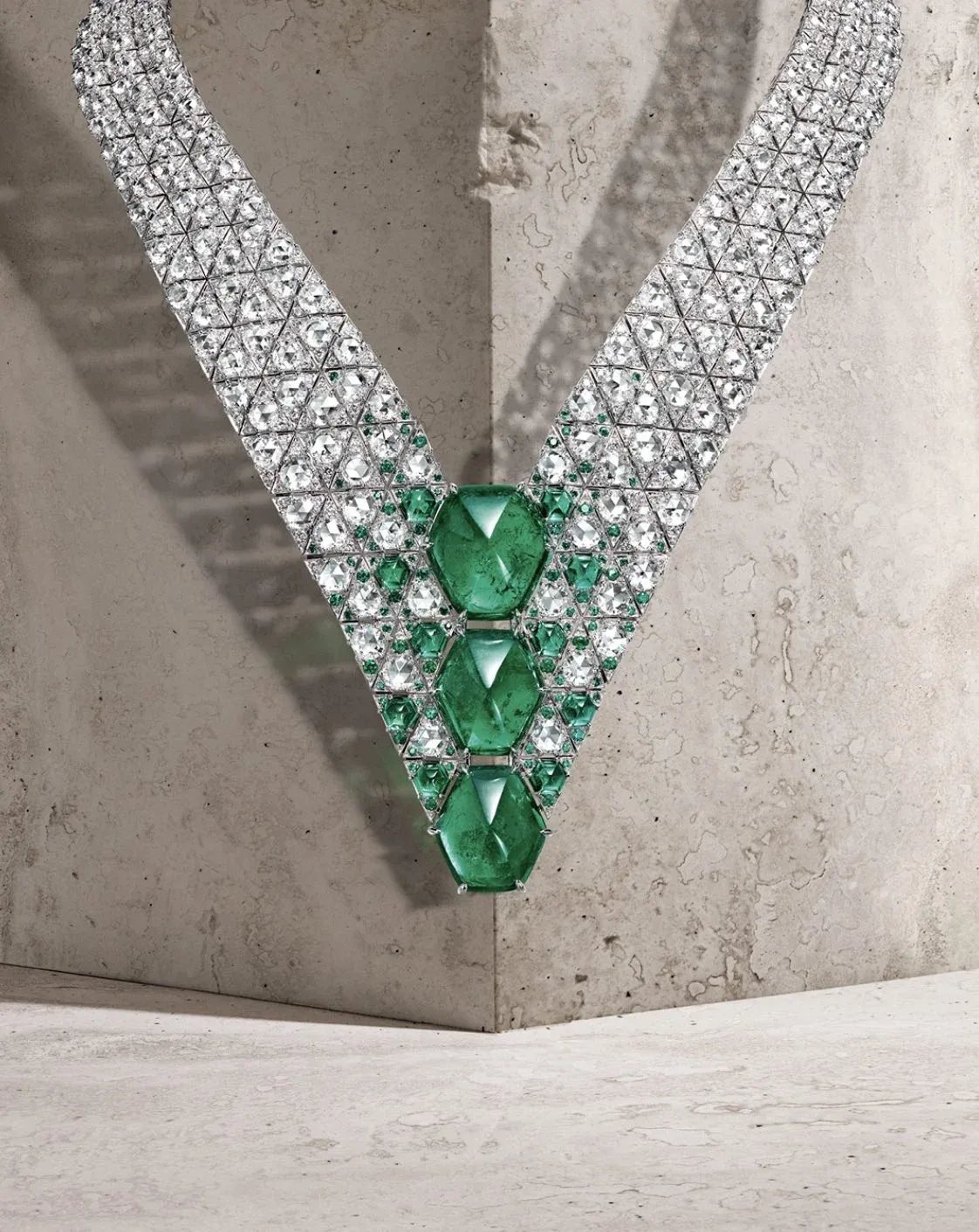 Struktura kůže leguána zeleného inspirovala designéry domu Cartier k vytvoření tohoto setu. Svou krásu odráží v náhrdelníku honosně osázeného diamanty a smaragdy. Vše je založeno na mírném vlnění osazení evokující pohyb a ladnost tvora. Šperkař zvýrazňuje texturu optickou hrou sledu diamantů vykládaných do trojúhelníků, tvořících základnu pro tři ohromné kolumbijské smaragdy vážící 43,45 karátu. Jejich, pro Cartier typický, čtyřstranný brus, je tvarován tak, aby připomínal hřbetní páteř zvířete.