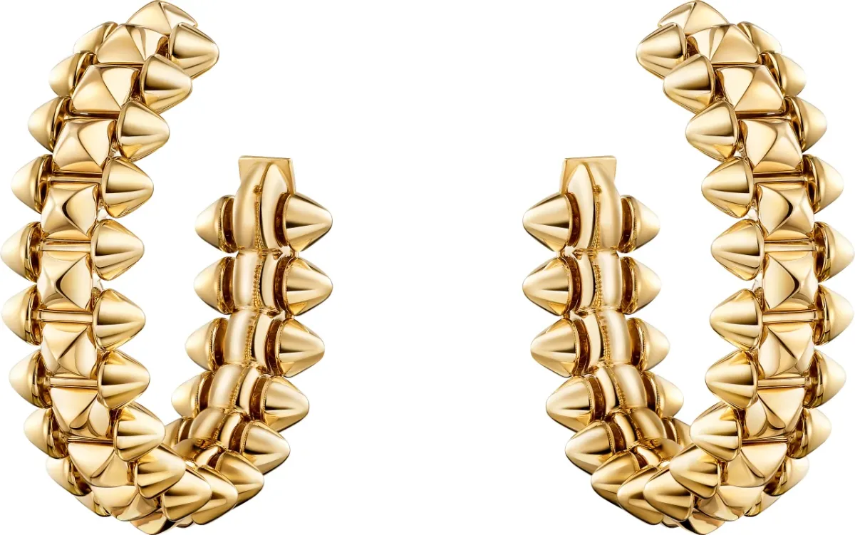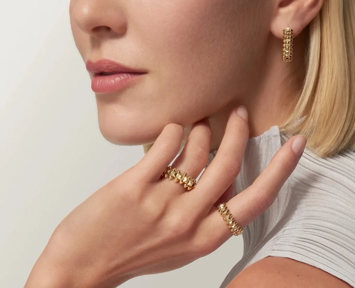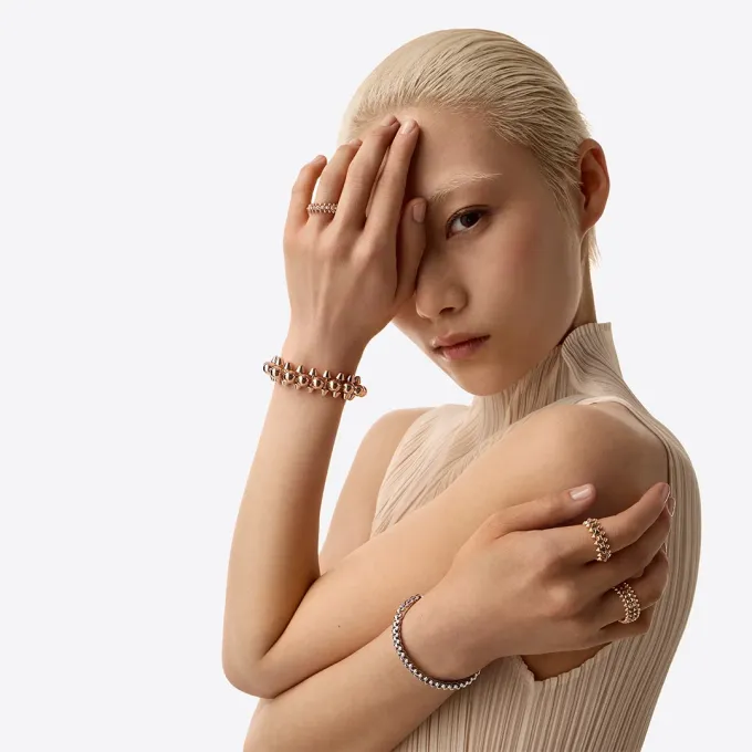 Clash de Cartier je postavená na napětí. Vizuálním, haptickém, konceptuálním. Vznikla z potřeby vyjádřit víc než jen krásu – říká něco o nositeli, o jeho postoji k životu. Spojuje strohost geometrie s měkkostí pohybu, kombinuje ostré pyramidové formy se smyslnou pružností. Když se na šperk podíváte, vidíte pravidla. Když ho vezmete do ruky, cítíte svobodu. A právě v tom je jeho kouzlo. Tento kontrast není náhodný. Cartier vědomě staví klasickou francouzskou eleganci proti prvkům punku a industriální estetiky. V kolekci se opakují motivy clous carrés – drobných hranatých „cvoků“, které se díky precizní konstrukci pohybují s tělem, aniž by ztrácely formu. Vizuální síla je tak vyvážena ergonomií, šperk není statický, ale žije s nositelem.