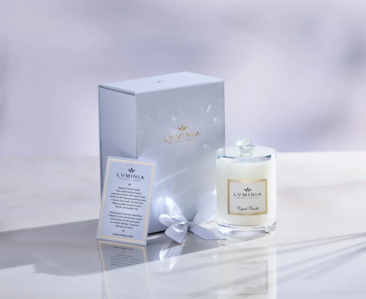 Nádoby na svíčky ručně foukají čeští skláři z pravého Bohemia křišťálu. Každá nádobka je malým uměleckým dílem, které tvoří 6 párů precizních rukou a jeho výroba trvá 2 dny. Nádobka má čisté linie přesného válce, má rovné dno a precizně zabroušené hrany. Křišťál je sám o sobě hodnotný, krásně čirý a třpytivý. Většina zákazníků, když jim dohoří svíčka, používá křišťálovou nádobku dále. Samostatný příběh se váže také ke vzniku křišťálového víčka. Celý proces trval neuvěřitelné dva roky. Hledala jsem výrobce, který bude umět vyrobit dva dokonalé kruhy slepené „neviditelným“ lepem a na vrchu bude broušený diamant. Počet odmítnutí se slovy, že se něco takového vyrobit nedá, nespočtu, já jsem si však šla za svým a hledala dál. A dnes víčka korunují naše LUMINIA svíčky a později zdobí krásné nádobky v interiérech našich klientů.