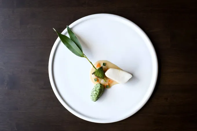 Jedním z vrcholů menu je „Chilled Carrot Soup with Yuba, Mustard Seeds, and Ash“, kde je chladivá mrkvová polévka servírována s jemnými plátky yuby (sojové kůžičky) a křupavými hořčičnými semínky, což vytváří harmonii mezi sladkostí mrkve a pikantností hořčice. Tento pokrm je skvělou ukázkou minimalistického přístupu, který se v Coi uplatňuje – důraz je kladen na čistotu chutí a precizní prezentaci.