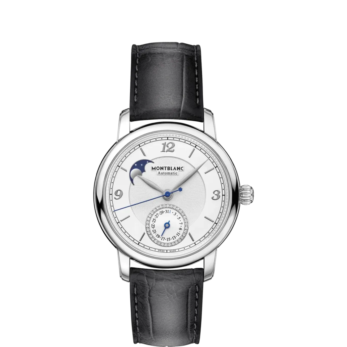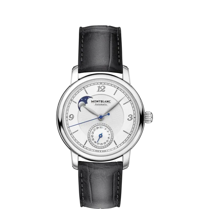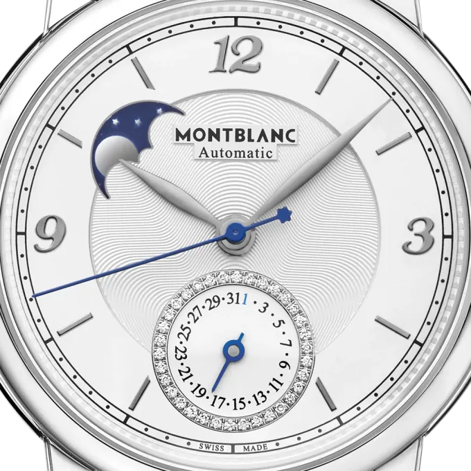 Stejně jako všechny modely z kolekce Star Legacy pro ženy i hodinky Star Legacy Moonphase & Date zdobí diamanty v kruhu okolo ukazatele data na pozici 6 hodin. Tento šperkařský prvek je nejenom novým prvkem domu Montblanc, ale ve světě hodinářství také neobvyklým. Hodinky jsou k dostání v 36mm kulatém pouzdře z oceli se stříbrno-bílým ciferníkem s dekorem guilloché, doplněné o rhodiem černě potažené arabské číslice, indexy a ručičky listového tvaru.