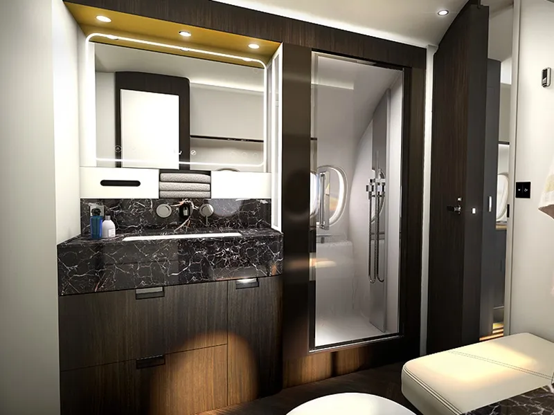 To, co Falcon 10X odlišuje od konkurence na první pohled, je právě velkorysost vnitřního prostoru. Zapomeňte na kompromisy, tady se počítá s plnohodnotnou ložnicí s manželskou postelí a koupelnou, ve které se můžete skutečně pohodlně osprchovat. Kabina je rozdělena do čtyř samostatných zón, které si majitel může poskládat jako stavebnici podle toho, jestli zrovna potřebuje vést klidné obchodní jednání, nebo chce v soukromí sledovat film. Díky obrovským oknům, která jsou po celém obvodu trupu, je vnitřek zaplaven přirozeným světlem, což dramaticky mění pocit z pobytu na palubě a pomáhá vám cítit se svěže i po dvanáctihodinovém přeletu oceánu.