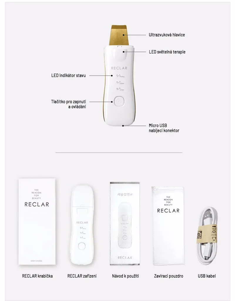 Vaše pleť bude hloubkově vyčištěna, díky modrému světlu se začnou hojit pupínky a zároveň předejdete jejich vzniku. Červené světlo zase dokonale odstraní vrásky, čímž dokáže stáhnout i póry. Hlavice je pokryta z 99,91% ryzím zlatem a špachtle je vhodná i pro tu nejcitlivější pleť.