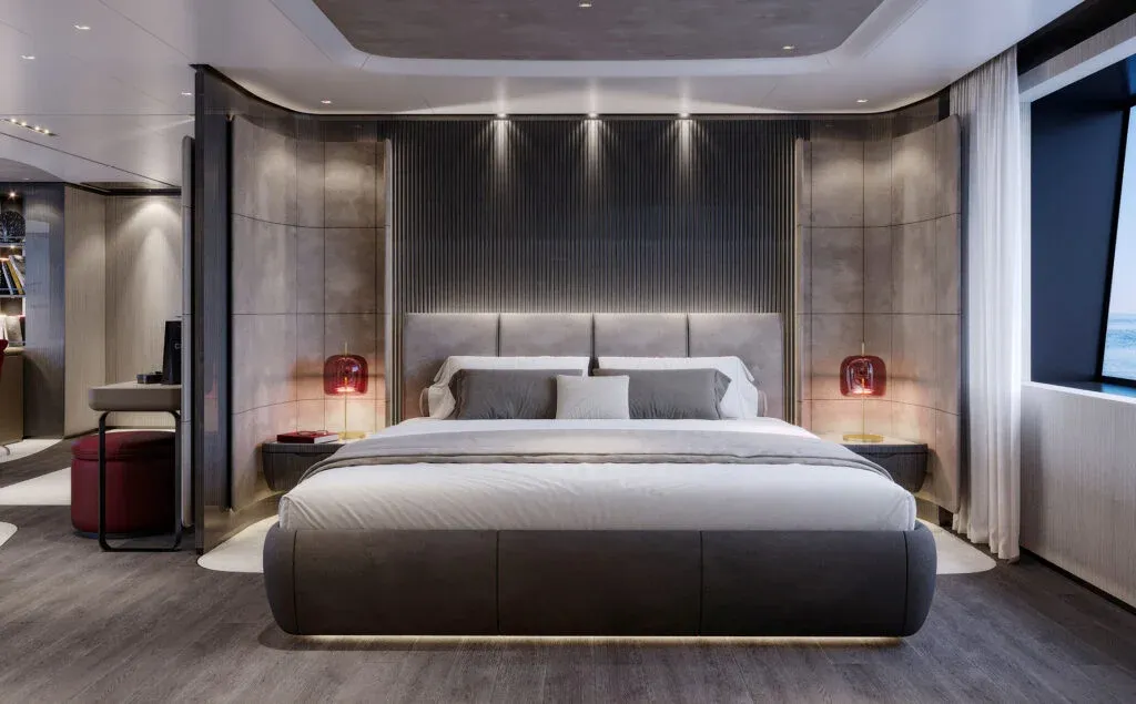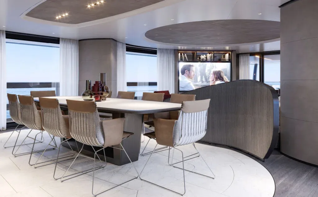 Interiér jachty je navržen jako oáza klidu a sofistikovanosti, která plně využívá štědrý vnitřní objem pro zajištění absolutního soukromí a pohodlí hostů. Designéři se zaměřili na smazání hranic mezi vnitřním prostorem a okolním mořem, čehož dosáhli instalací rozměrných prosklených ploch a skládacích balkonů v hlavním salonu. Použití přírodních materiálů nejvyšší kvality, jako je exotické dřevo, jemná kůže a leštěný kámen, vytváří atmosféru, která je zároveň moderní i nadčasová, a nabízí tak ideální zázemí pro náročnou klientelu.