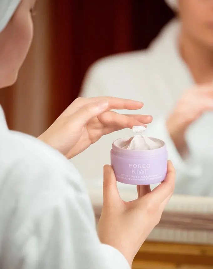 Nedílnou součástí ošetření KIWI™ Skin Refining Treatment je nová maska KIWI™ Active Pore & Black Head Mask tvořená z 98 % ingrediencemi přírodního původu, která pleť šetrně čistí, TZ Foreo - Nové ošetření zdokonaluje, zjemňuje a rozjasňuje. Díky vysokému obsahu detoxikačního jílu a účinného komplexu rostlinných olejů připraví pleť na následný krok - zařízení KIWI™ Derma. Jojobový, mokřadkový a baobabový olej změkčují pokožku i nečistoty, které se postupem času usadily v pórech, a usnadňují tak jejich odstranění.