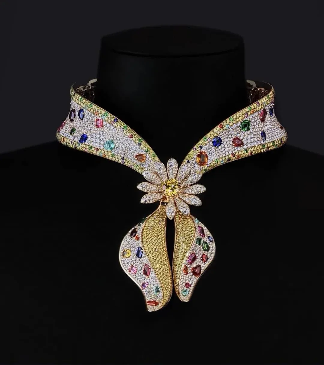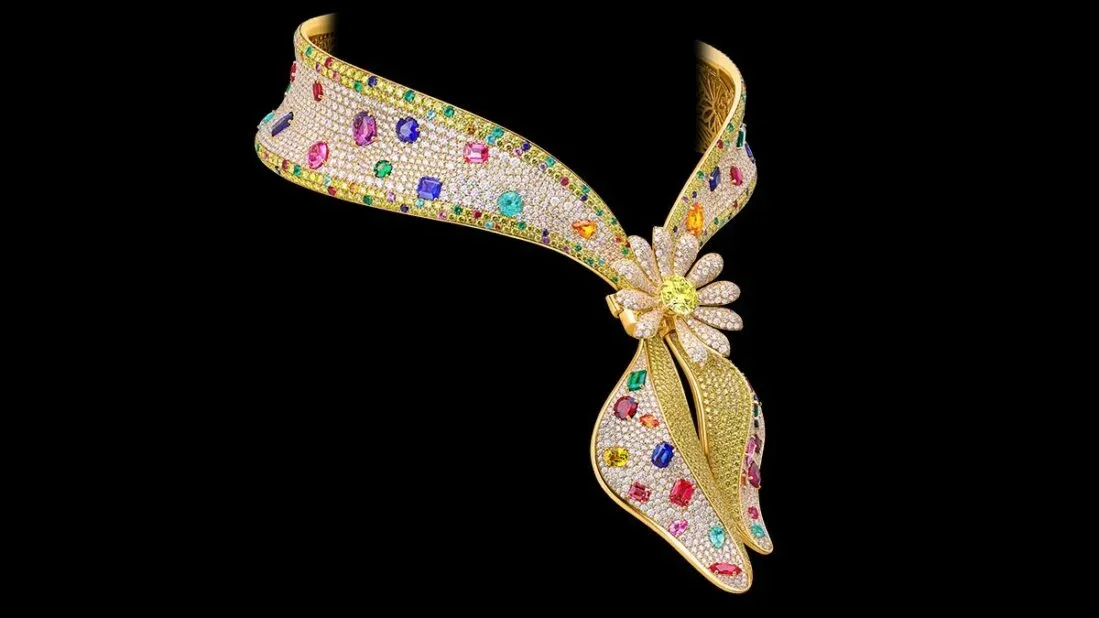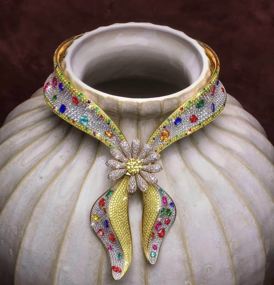 Design šperku mistrně simuluje splývavou siluetu a měkké záhyby látkové bandany, ačkoli je vyroben z neuvěřitelných 559 gramů osmnáctikarátového žlutého zlata. Celý povrch náhrdelníku připomíná zářivé plátno posázené drahokamy o celkové hmotnosti téměř 210 karátů. Základní texturu tvoří více než dva tisíce brilantových bílých diamantů, které doplňuje stovky žlutých diamantů a široká paleta barevných drahokamů. Tato kombinace safírů, rubínů, smaragdů a tourmalínů vytváří na krku nositele duhový efekt, který svou intenzitou a leskem daleko přesahuje možnosti běžné bižuterie.