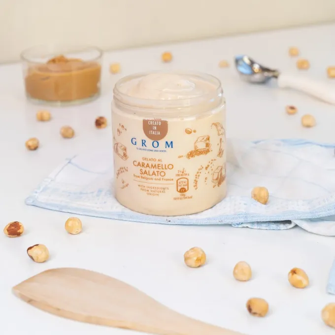 Na proslulou pistáciovou příchuť snad už ani není třeba dělat reklamu, ale ochutnali jste už letošní novou příchuť v pintách – slaný karamel? Grom se inspiroval tradicí skvělého francouzského cukrářství a použil himalájskou sůl, která je charakteristická tím, že kromě soli obsahuje dalších osmdesát minerálů a je méně agresivní a lépe balancuje chuť sladkého karamelu a bílého třtinového cukru. Tuto příchuť naleznete samozřejmě také přímo v gelaterii Grom.