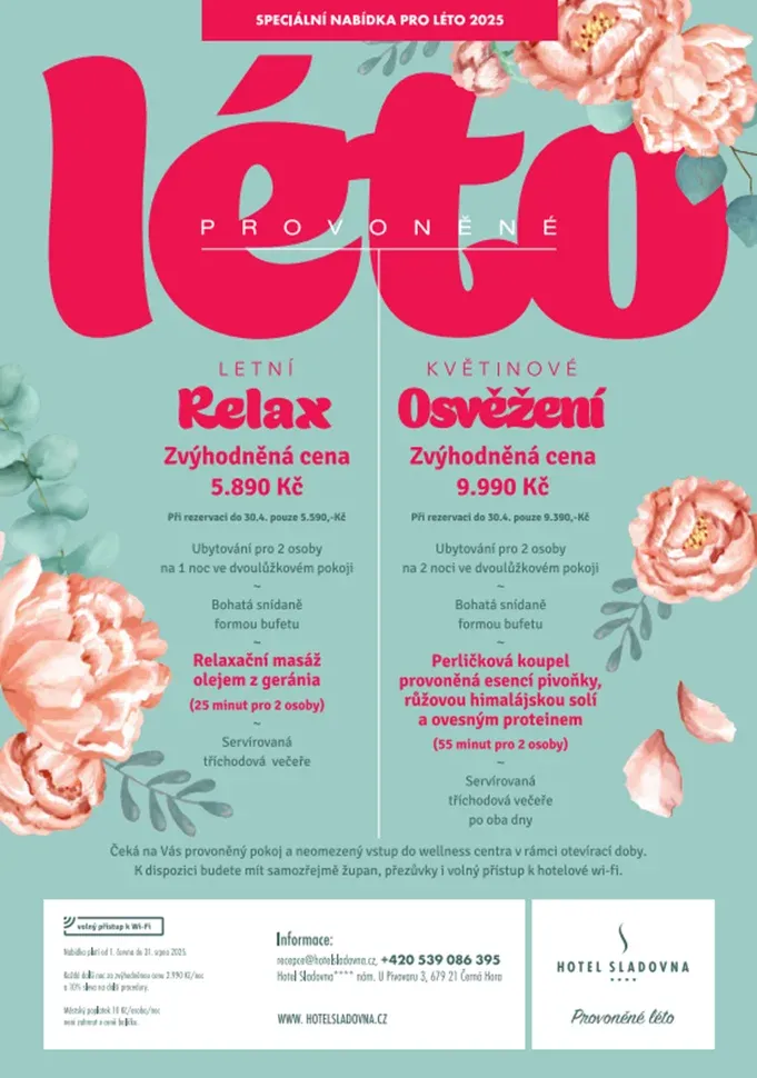 Pro letošní letní sezonu hotel přináší exkluzivní nabídku, která hostům umožňuje prodloužit si pobyt bez navýšení nákladů. Speciální akce s názvem „Relaxujte déle, plaťte méně“ platí pro nově vytvořené rezervace v období od 1. července do 31. srpna 2025, přičemž hosté při pobytu na tři noci zaplatí pouze dvě. V ceně je zahrnuta bohatá snídaně a možnost pohodlné rezervace polopenze přímo na hotelové recepci. Akci nelze kombinovat s jinými slevami a nevztahuje se na termín od 17. do 20. července 2025. Tato nabídka je vhodná pro každého, kdo chce v létě zpomalit, načerpat energii a zároveň využít výhodnou cenu.