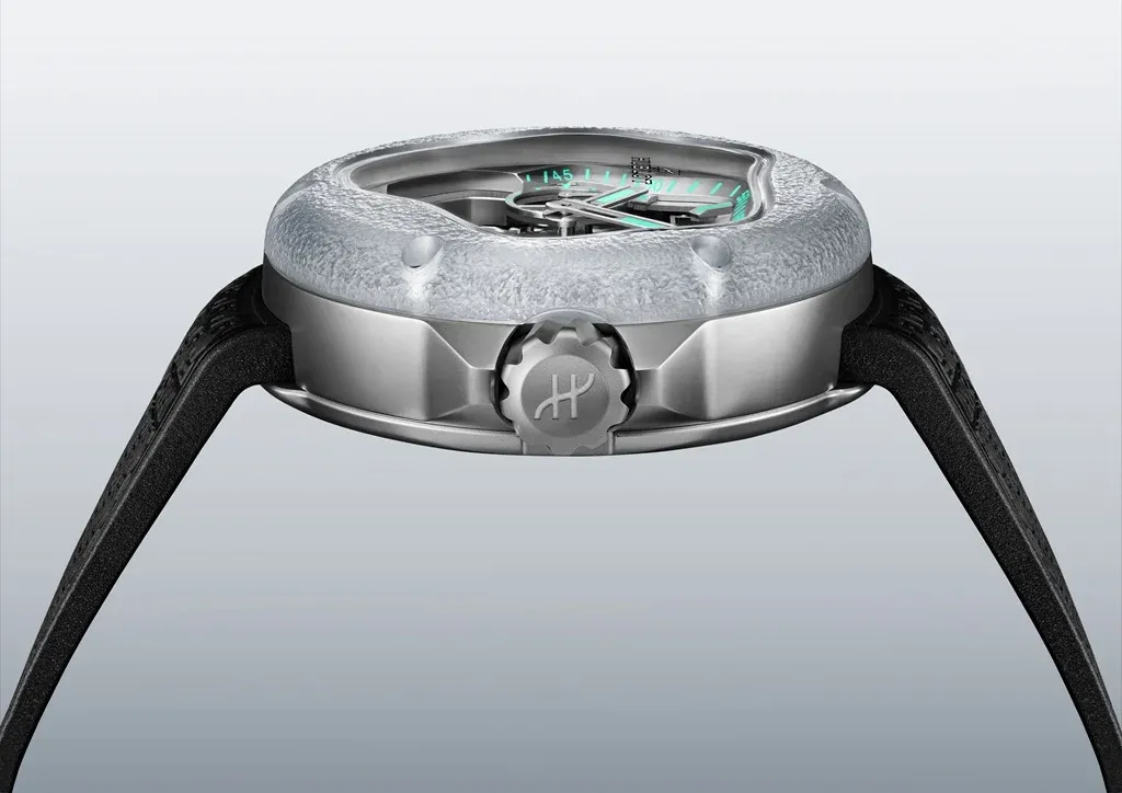 Volba materiálů – safírového krystalu (použitého na matně broušené lunetě), titanu a kaučuku – dokonale vystihuje filozofii Art of Fusion, tedy spojení zdánlivě neslučitelných světů. Právě tyto materiály vytvořily ideální základ pro organické linie hodinek inspirované pohybem vody. Dominantním prvkem je výrazný otvor s tvarem připomínajícím roztékající se kapku vody, který navazuje na motiv z modelu MP-16 Arsham Droplet.