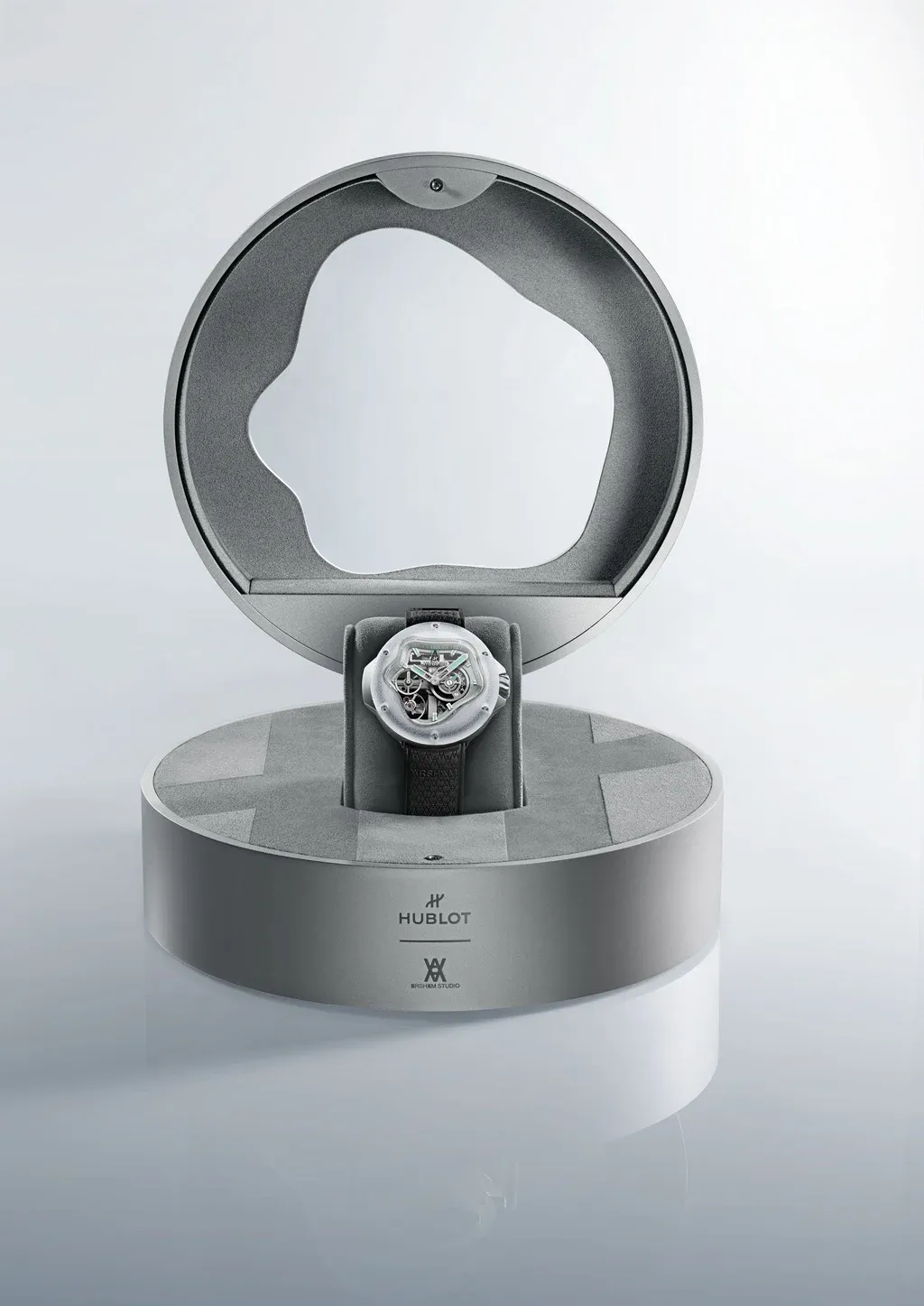 Arshamův první návrh náramkových hodinek pro Hublot působí spíš jako socha, kterou můžete nosit na ruce a která vyzařuje jeho kreativní rukopis v každé plynulé křivce. Kompaktní pouzdro o velikosti 42 mm vzniklo díky integraci nového menšího strojku Meca-10 z dílen Hublot, který lze obdivovat z obou stran – skrze číselník i průhledné safírové dýnko.