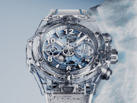 Model Big Bang Unico Winter Sapphire vznikl v limitované edici 30 kusů a díky transparentnímu safírovému pouzdru o průměru 42 mm představuje jeden z vrcholů materiálového zpracování současného hodinářství. Safír s výjimečnou tvrdostí i průhledností umožňuje vyniknout architektuře strojku, přičemž systém One Click zajišťuje rychlou výměnu pásku – součástí jsou dvě varianty v bílé či ledově modré kombinaci kaučuku a telecí kůže.