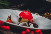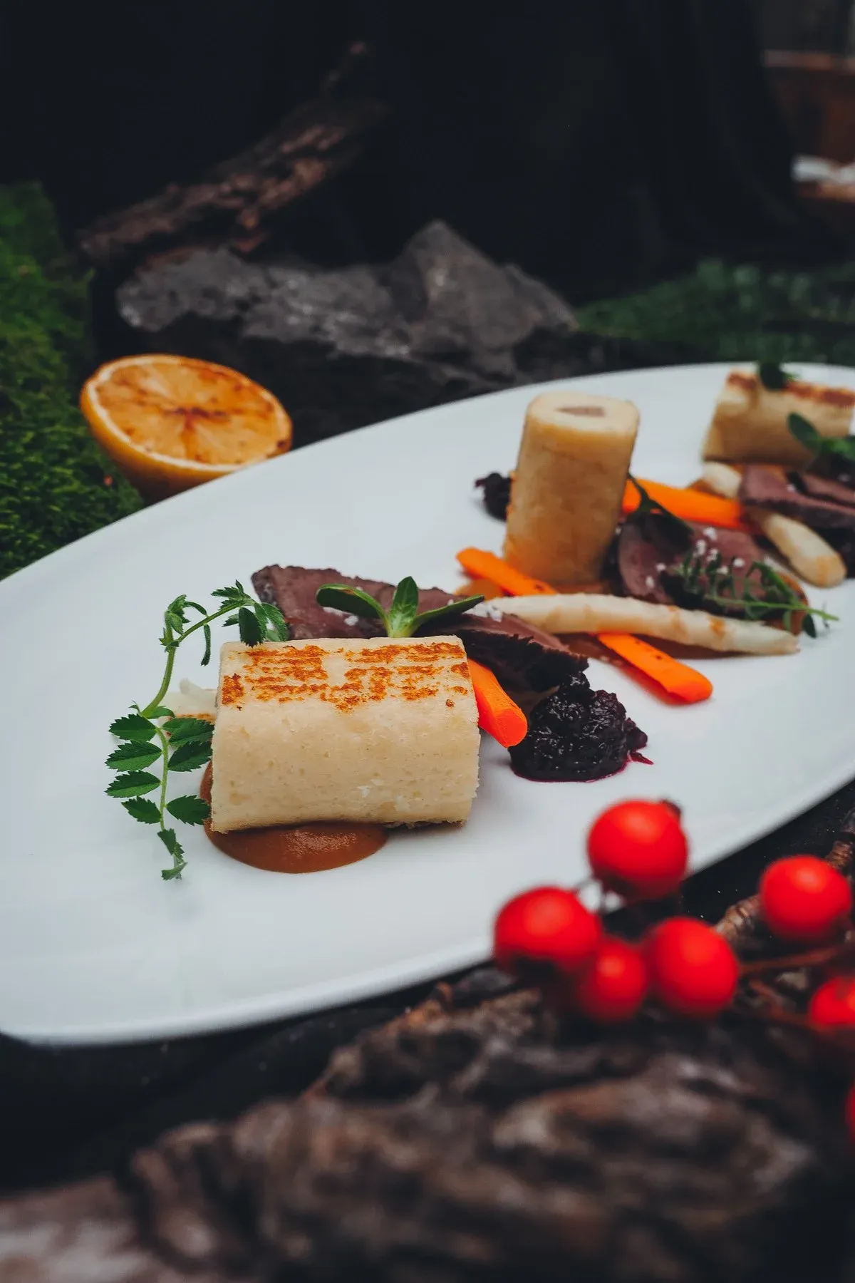 Pro pohlazení chuťových pohárků v menu samozřejmě nechybí amuse bouche, po němž následuje úžasné dančí carpaccio s nakládanými liškami a kaštanovým krémem. Aby toho ale před hlavním chodem nebylo málo, máte možnost si pochutnat ještě na raviolech s jelením masem a dýňovým pyré, které mě překvapily snad nejvíce z celého menu. Něco tak chutného jsem totiž dlouho neměl. Nejvíce jsem se ale těšil na jelení hřbet, který se podával s bramborovými nočky, zeleninovým pyré a brusinkami. Musím uznat, že kombinace jeleního masa a brusinek je prostě úžasná, jídlo se mi tak rozplývalo na jazyku, že jsem si ani neuvědomoval, kde právě jsem. Soustředil jsem se jen na chuť.