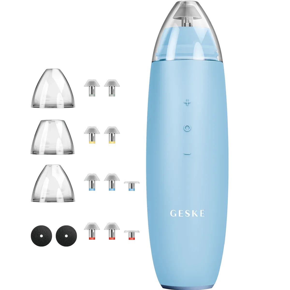 MicroDermabrasion Blackhead Remover | 7 in 1 účinně odstraňuje nečistoty z pórů, vyhlazuje pleť a podporuje její přirozený jas. Rozlučte se s černými tečkami a přivítejte čistou, zářivou a bezchybnou pleť. Díky kombinaci patentovaných technologií je vaše pleť na nejlepší cestě k té nejčistší, jakou kdy měla. Hloubkové čištění pórů AirPulse Suction šetrně odsaje pomocí směrovaných vzduchových pulzů zbytky make-upu, oleje, odumřelou pokožku a samozřejmě černé a bílé tečky. Jako doplněk poskytuje technologie MicroDermabrasion na nečistoty pleti přizpůsobitelnou péči o pleť specifickou pro vaši pleť. Aby vaše pleť zůstala bez nečistot, doporučuje GESKE používat vestavěnou technologii aktivní regenerace červeným světlem.