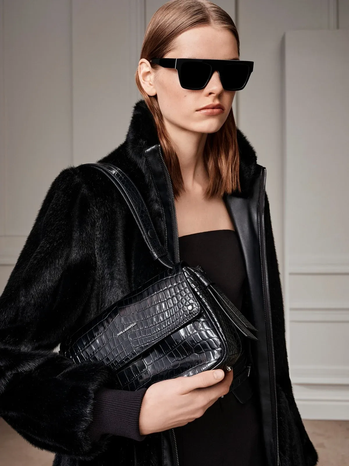 Kolekce nás také zavede do Anglie, do šatníku královny Anny a její důvěrnice Sarah Churchill, vévodkyně z Marlboroughu. Tento styl se promítá do velmi strukturované krejčoviny s výraznými rameny, objemnými rukávy a koženým vzhledem od hlavy až k patě. Nalezneme zde oversize kokonové kabáty, sametové peleríny, moderní poncha a technicky propracované trench coaty. V proužkovaném pánském obleku je pak znatelný pánský vliv, stejně tak v celokožených šatech nebo svetru s detailem starodávné výšivky.
